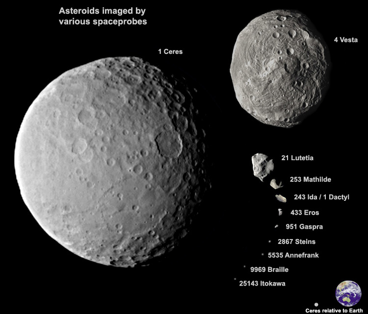There seems to be two main theories as to how the asteroids came into existence. The first suggests that they are the remnants of a planet destroyed in a massive collision long ago and the second, and it seems the most popular, is that they are left over rocky matter that failed to coalesce into a planet during the formation of the Solar System. Most known asteroids (about 95%) orbit in the asteroid belt, or main belt, between the orbit of Mars and Jupiter at distances of 1.7 to 4.0 astronomical units from the Sun. (One astronomical unit is equivalent to the distance from the Earth to the Sun or 149,597,870 kilometers). These main belt asteroids orbit the Sun in periods between 3 and 6 years. Like the planets, most asteroids follow direct orbits within 10 degrees of the plane of the ecliptic (The average plane of the Earth's orbit around the Sun) although in a more pronounced ellipses than the orbits of the planets. Other asteroids have very different orbits from these main belt objects and indeed some, the Atens group even cross the orbit of the Earth and are the subject of close scrutiny by some of the world's major observatories. Another group, the Trojans, orbits the Sun 60 degrees ahead and behind Jupiter in its orbit. Asteroids vary in size from the largest, the 933 km diameter Ceres, to objects much less than 1km wide. Ceres however has now been taken from the list of asteroids and classified as a "dwarf planet" along with Pluto. It was discovered on the first day of January 1801 by Giuseppe Piazzi and at first was thought to be a comet. Asteroids shine by reflected sunlight and although there have been several hundred thousand discovered only one, Vesta, is sometimes bright enough to be seen with the naked eye. Even though it is not the largest of these objects it has a surface that reflects sunlight better than any of the others. Despite the great number of asteroids so far discovered their total mass is less that of the Earth's Moon.