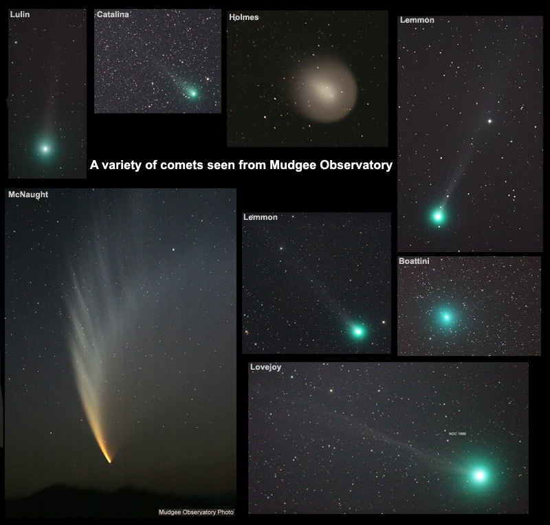 Comets are often referred to as dirty snowballs and are comprised mainly of dust and frozen gasses circling the Sun in highly elliptical orbits. As they approach the Sun they begin to sublimate, the outer part of the nucleus of the comet turning directly from a solid to a gas. The gas and dust is forced away from the head of the comet by radiation pressure and by the solar wind which usually results in two types of tails being formed, the ion tail and the dust tail. The ion tail, consisting of ionized molecules, points directly away from the Sun and is typically blue in colour. The dust tail contains solid particles which reflect sunlight and is more curved than the ion tail and lies back more in the direction of the comets orbit. These tails can be millions of kilometers long and are what makes some comets such a great spectacle.