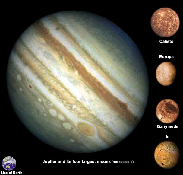 Jupiter orbits the Sun every 11.86 years at an average distance of 778 million km, over five times the distance of the Earth from the Sun. Its average orbital speed is 13.06 km/second and since its rotation axis is only tilted 3 degrees in relation to the perpendicular of its orbital plane, it has almost no seasonal variation. It is accompanied in its journey around the Sun by at least 95 moons (as of 2023), most of which are small rocky bodies. The larger moons, Io, Europa, Ganymede and Callisto are all bigger than the Earth's moon and are easily visible in even the smallest telescope. With a diameter of 5,262 km, Ganymede is the largest moon in the Solar System, even larger than the planet Mercury. These four moons were first seen by the astronomer Galileo Galilei in 1609 and are referred to as the Galilean Moons.