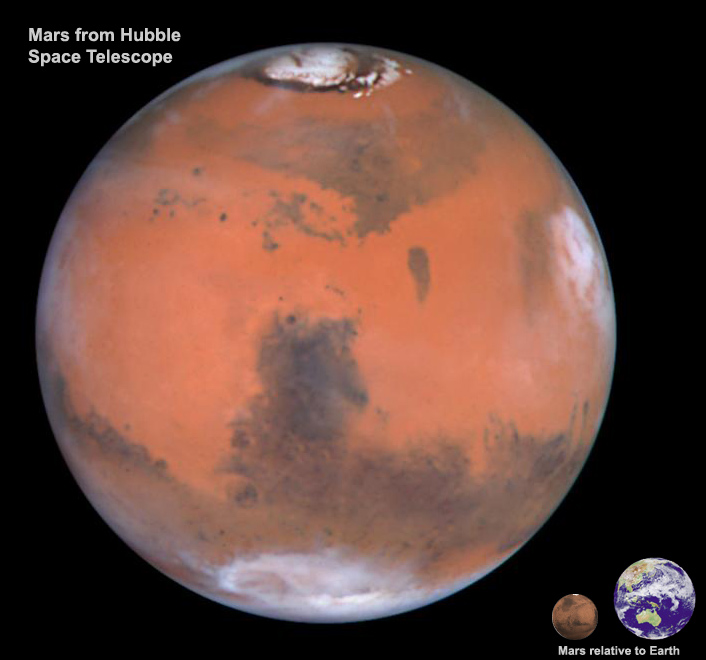 Mars has a diameter of 6,795 km, just over half the Earth's diameter and rotates once on its axis every 24 hours 37 minutes and 23 seconds. This axis is tilted at 29.19 degrees to its orbital plane and these values help to make the Red Planet the most Earth like of all the other planets even though it has only 28 percent of the Earth's surface area. Although there is no liquid water at present, the presence of ancient water courses on its surface point to the existence of running water in the ancient past. White polar caps expand and contract with the changing of the Martian seasons and the ancient volcanoes would have gushed out enough gas to make the earlier atmosphere much heavier than the 7 millibars that it is today. This is 0.007 percent of the Earth's atmospheric pressure and consists mainly of carbon dioxide (95 percent), nitrogen and argon. Olympus Mons, 600 km wide and towering 26 km above the surrounding plain, is the largest known volcano in the Solar System. It dwarfs the largest volcano on Earth, Hawaii's Mauna Kea which rises a mere 9.3 km from its 120 km diameter base on the floor of the Pacific Ocean. Another dramatic feature is Mariner Valley, a massive rift 75 km wide, up to 7 km deep and extending 4000 km across the planet and making the North American Grand Canyon look like a small crack in the ground.