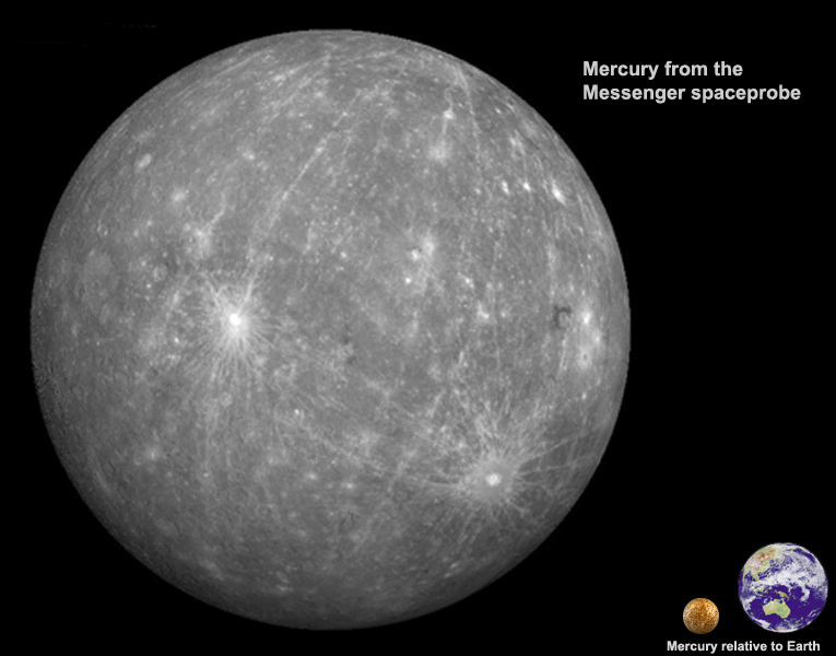 Photography of half of Mercury's surface by Mariner 10 in 1974 and 1975 showed it to resemble the Moon in being heavily cratered with intervening areas of lava flooded plains with the largest impact feature detected being 1,300 km in diameter. Whereas the features on the Moon are named after scientists and astronomers, the features on Mercury are named after world cultural figures such as architects, composers, writers and artists. As Mercury orbits so close to the Sun it can only be observed from the Earth in either morning or evening twilight and at times can be quite elusive as at its best only ventures 28 degrees in angular distance from the Sun. Transits of Mercury across the Sun's disc as seen from the Earth are reasonably common but can only occur in the months of May or November with the intervals at which they occur being 3, 7, 10 or 13 years. The next will occur on May 9th 2016.