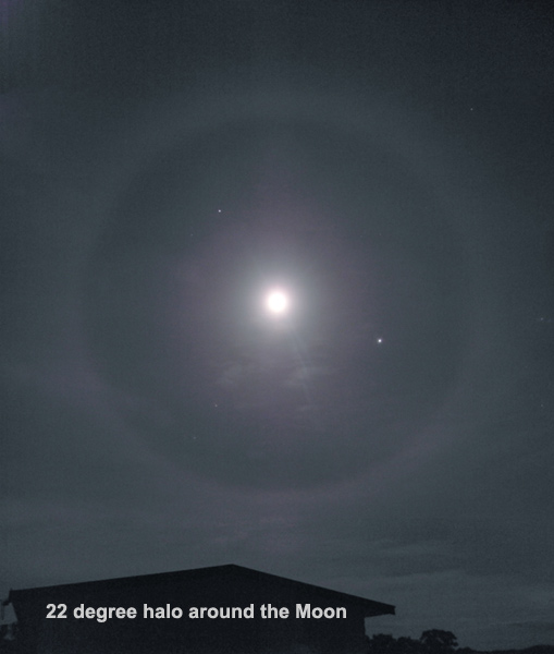 We tend to take the Moon for granted and most of us hardly give it a second glance. However when atmospheric conditions are right the moon can produce some interesting and rather stunning effects. Perhaps the most common of these effects are the Moon halos, large rings which circle the moon on a hazy cold night and have a radius of either 22 degrees or 46 degrees. The most frequently seen seem to be the 22 degrees halos. They are more intense when the Moon is at its brightest, around full Moon but can be witnessed to a lesser degree at other bright phases of the Moon. For the rings to appear there needs to be a layer of thin cloud containing millions of tiny ice crystals covering much of the sky high in the upper atmosphere. Each of these ice crystals behaves like a small lens and because most of these crystals have the same elongated hexagonal shape the moonlight entering one face of the crystal and exiting its opposing face is bent at an angle of 22 degrees. The larger 46 degrees ring which is far less typical may be caused by the light exiting at different angles from the crystals.