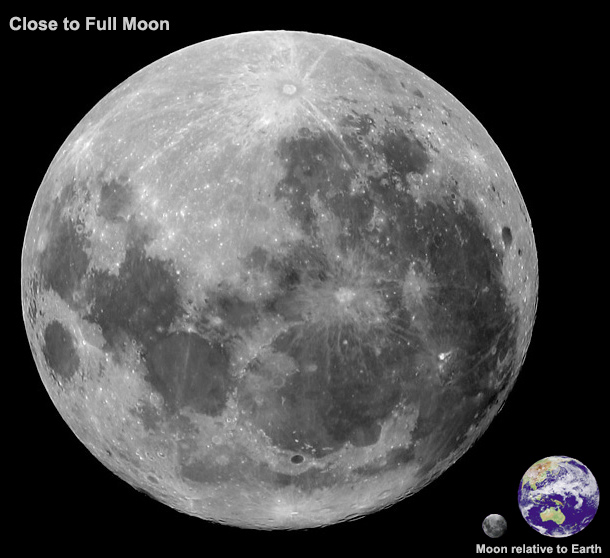 The only natural satellite of the Earth and the fifth largest natural satellite in the Solar System, the Moon is visible by virtue of reflected sunlight. It has a diameter of 3,476 km and lies at an average distance of 384,400 km from the Earth taking 27.322 days to complete one orbit at a speed of just over 1 km/second. This is the same amount of time it takes to spin once on its own axis and so always shows the same face to the Earth. Because the Moon wobbles slightly as it orbits we get to see about 59% of its surface. Since the Earth is moving in its orbit around the Sun as the Moon orbits the Earth it takes a little longer to go through its cycle of phases as The only natural satellite of the Earth and the fifth largest natural satellite in the Solar System, the Moon is visible by virtue of reflected sunlight. It has a diameter of 3,476 km and lies at an average distance of 384,400 km from the Earth taking 27.322 days to complete one orbit at a speed of just over 1 km/second. This is the same amount of time it takes to spin once on its own axis and so always shows the same face to the Earth. Because the Moon wobbles slightly as it orbits we get to see about 59% of its surface. Since the Earth is moving in its orbit around the Sun as the Moon orbits the Earth it takes a little longer to go through its cycle of phases as seen from the Earth. From one full Moon to the next a period of 29.5 days elapses. Each spot on the Moon is subjected to two weeks of daylight during which surface temperatures reach 100 degrees C and two weeks of darkness when the temperature plummets to -170 degrees.