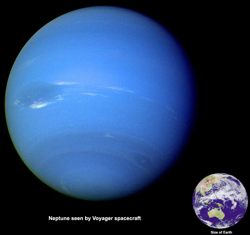 With the reclassification of Pluto as a dwarf planet, Neptune is now the outermost of the Solar System's planetary family and the smallest of the gas giants. It was named after the ancient Roman god of the sea, Poseidon to the ancient Greeks. With a diameter of 49,492 km it is large enough, if it were hollow, to hold thirty Earths. It orbits the Sun every 164.79 years at an average speed of 5.45 km/second and an average distance of 4,504,300,000 km. This is thirty times the distance the Earth is from the Sun and is the most circular of all the planetary orbits. Neptune's core is thought to rocky, primarily consisting of iron and silicon surrounded by an atmosphere of 84 percent hydrogen and 14 percent helium. The other 2 percent is methane with minute traces of carbon monoxide, hydrogen cyanide, acetylene and ethane. The planet radiates twice as much heat as it receives from the Sun resulting in wind speeds of up to 2,000 km/hour being recorded in its upper atmosphere, the strongest winds of any of the planets.