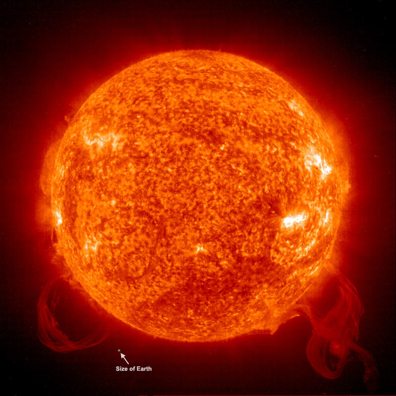 The Sun is composed mainly of hydrogen (70%) and helium (28%) with about 2% of heavier elements. It generates its energy by the nuclear fusion process and is losing mass at a rate of 4 million tonnes every second. It can take as long as 20 million years for the energy created in the core to reach the Sun's surface. This energy is given off as heat and light and a low density stream of charged particles known as the solar wind which blows throughout the solar system at speeds of 450km/second.