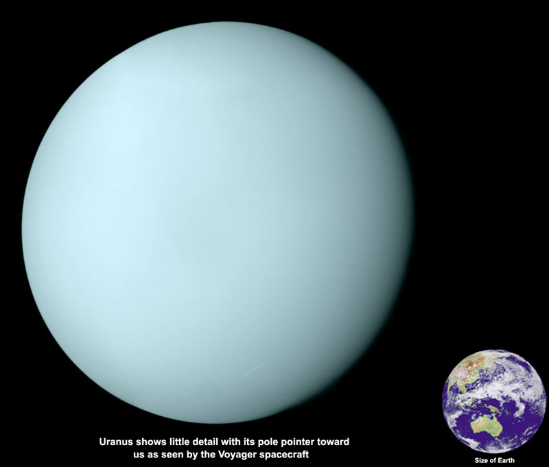 At its brightest Uranus should in theory be detectable to the naked eye but only appears as a faint star, so faint that it was never noticed by ancient astronomers for whom the Solar System stopped at Saturn. Discovered by William Herschel on March 13th 1781, it was the first of the planets to be discovered telescopically. In 1977 astronomers watched as Uranus passed in front of a star. Unexpectedly they noticed the star winked on and off a number of times both before and after being obscured by the disc of the planet. From this observation and others like it which followed astronomers deduced that Uranus was encircled by nine rings, so faint that they are not visible through a telescope from the Earth. Voyager 2 confirmed the discovery in 1986 finding eleven rings and also taking the number of discovered moons to twenty one. The planet is thought to have a rocky core consisting mainly of iron and silicon which is about the size of the Earth. This core is enveloped in a thick layer of liquid ice and rock but unlike Jupiter and Saturn it lacks a layer of metallic hydrogen. Its outer atmosphere is made up of 84 percent hydrogen, 14 percent helium and the other 2 percent contains methane, acetylene, hydrogen cyanide and carbon monoxide.