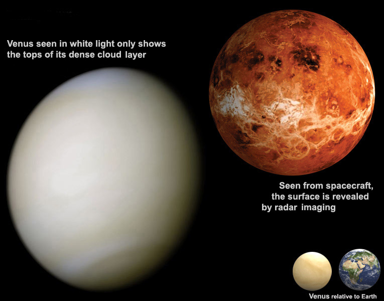 The second planet from the Sun, Venus is the brightest object in the night sky apart from the Moon. One of the reasons it is so bright is the very high reflectivity of its upper atmosphere which reflects 76 percent of the light it receives from the Sun. It is also the planet which comes the closest to the Earth, at times being closer than 42,000,000 km. Depending on its position in its orbit around the sun it can be seen as either the "Morning Star" or the "Evening Star" sometimes rising before the Sun in the morning sky and sometimes setting after the Sun in the evening sky. Ancient astronomers thought that the "Morning Star" and the "Evening Star" were two different objects and named them Phosphorus and Hesperus. It was Pythagoras, a Greek mathematician and philosopher, who realized that they were in fact the same object. With an equatorial diameter of 12,104 km it was envisaged that Venus was the Earth's sister planet and was very similar to the Earth in its makeup. This could not be further from the truth as space probes have revealed extremely hostile atmospheric and surface conditions. The atmospheric pressure on Venus is 91 times greater than the atmospheric pressure here on Earth with the atmosphere saturated with clouds of sulfuric acid aerosols.