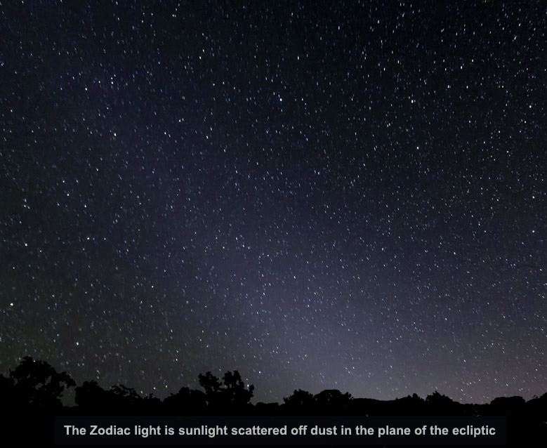 The Zodiacal light is often confused with the brightness of the sky due to a lingering twilight as it occurs in roughly the same area of the sky. It is produced by sunlight reflecting off cosmic dust particles in orbit around the Sun. Most of the particles that can be seen have sizes in the range from 10-100 micrometers and are produced by decaying comets and colliding asteroids and are spiraling slowly in towards the solar surface.